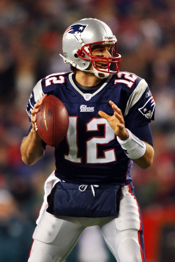 Most touchdown passes in a single season for Tom Brady (photo left #12) who's got already 48 TD passes (record:49) with a huge percentage of completion (68.3) and his rating is simply amazing(117.2) with only 8 interceptions thrown on his 536 last pass attempts!